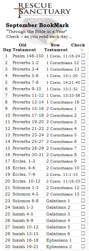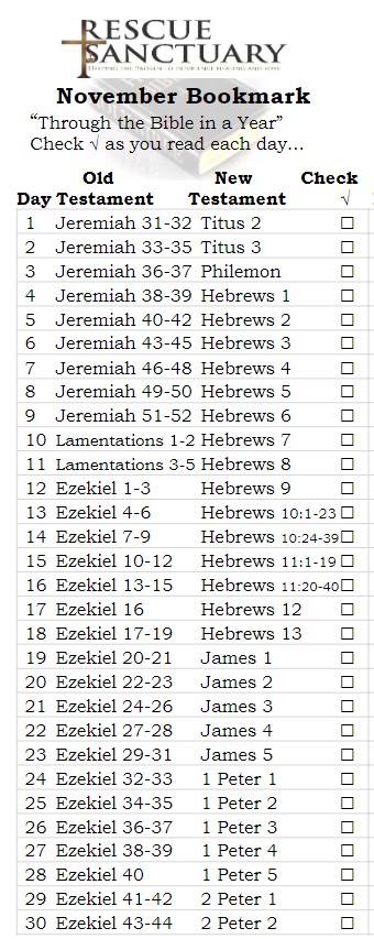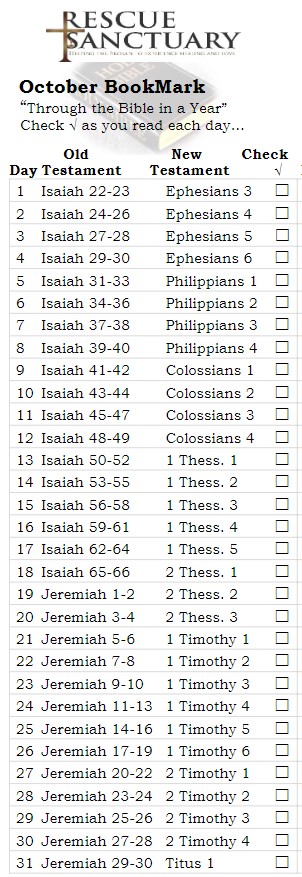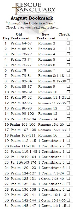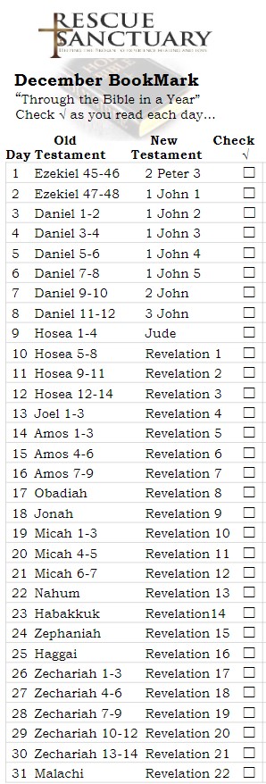 Want to start a plan that will help you read the Bible in one year? We have attached a copy of our monthly bookmark “Through the Bible in a Year” to help you get started. We have found that our ability to be faithful in our reading is enhanced if we have a guide, a chart where we can keep track of what we’ve read and where we are in the process.